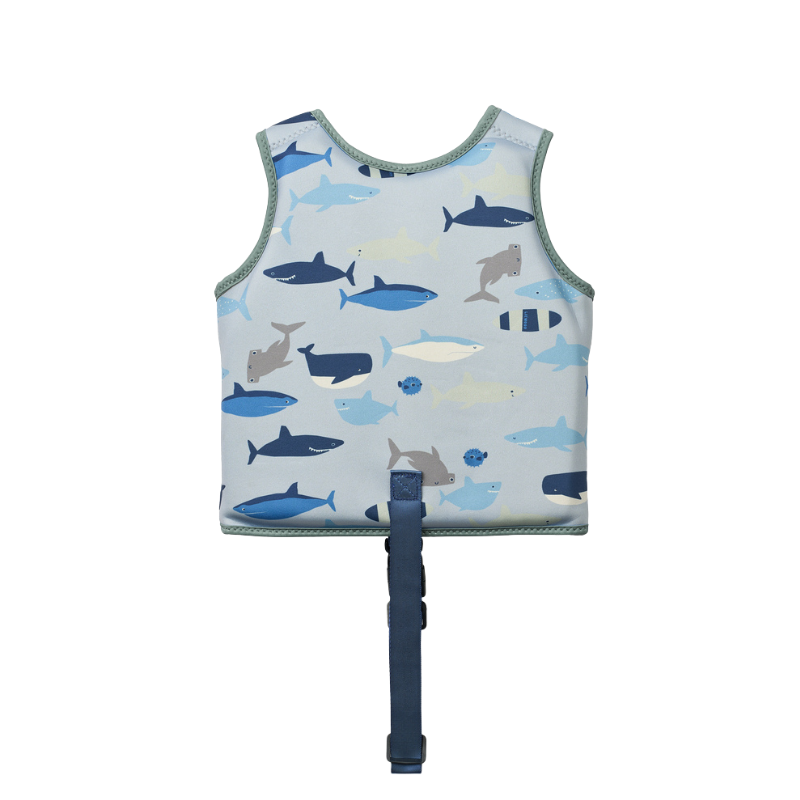 Het zachte materiaal voelt prettig aan op de huid en is lichtgewicht, waardoor kinderen comfortabel kunnen zwemmen en spelen. Het vest droogt snel en is eenvoudig schoon te maken. Dankzij het vrolijke Shark / Dove blue-design wordt zwemmen nog leuker en speelser.