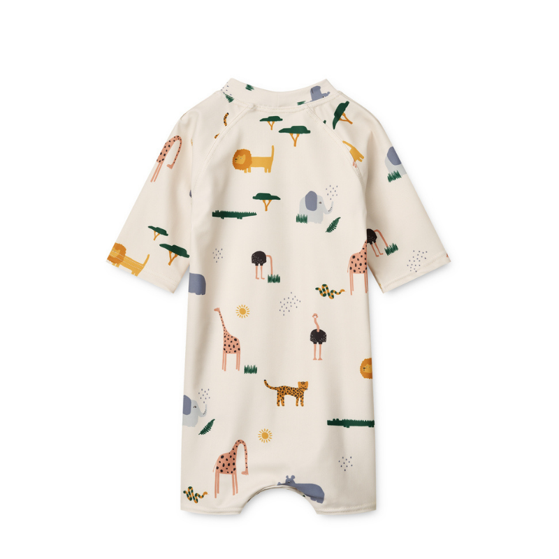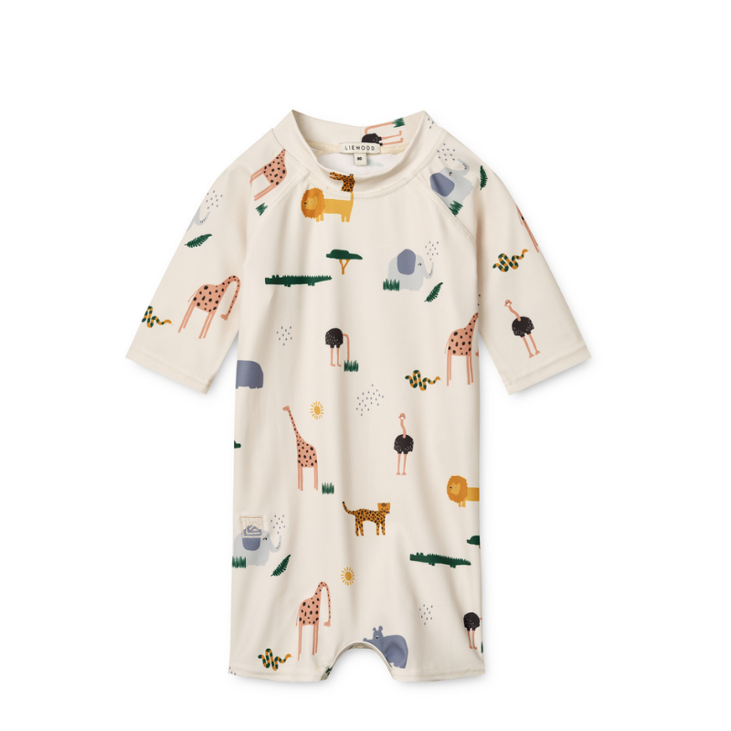 De Liewood Thor Baby Swim Jumpsuit Safari Sandy Mix is een comfortabel en beschermend baby UV zwempak, ontworpen voor de eerste wateravonturen van je baby. Dit babyzwempak met korte mouwen combineert bewegingsvrijheid, duurzaamheid en UV40+ zonbescherming — ideaal voor strand, zwembad en vakantie.
