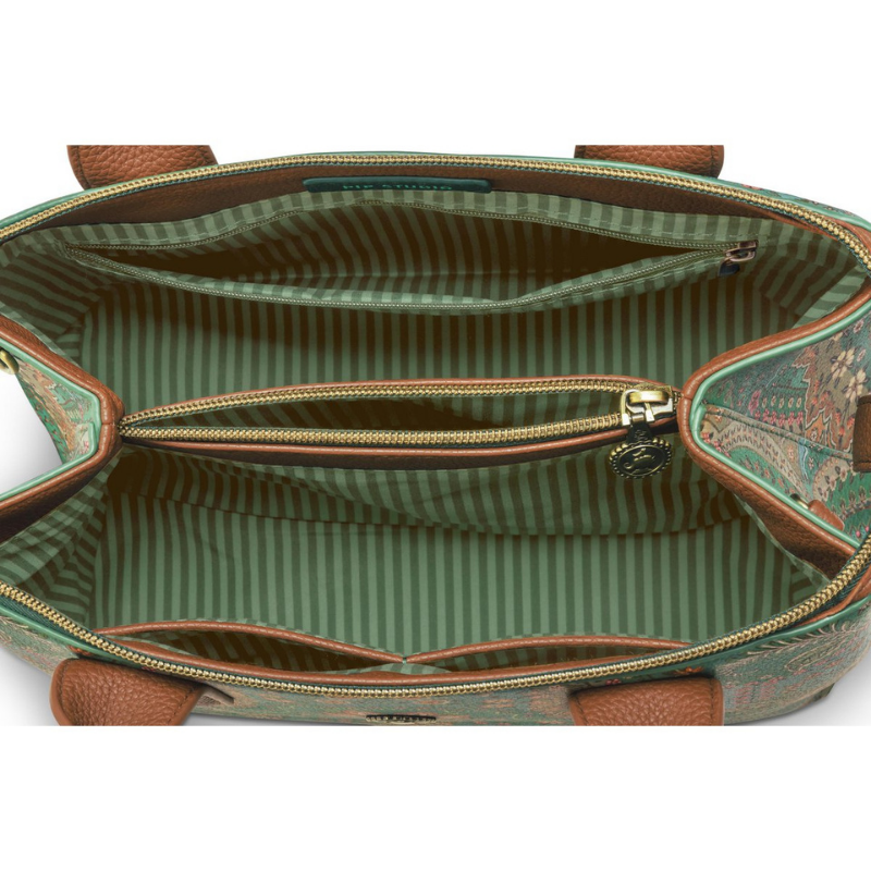 De Pip Studio Fia Handbag Medium – Jabali Greenis een stijlvolle en elegante handtas voor dames die functionaliteit combineert met het herkenbare kleurrijke design van Pip Studio. De opvallende Jabali-print met verfijnde bloemenpatronen geeft deze tas een unieke en levendige uitstraling.